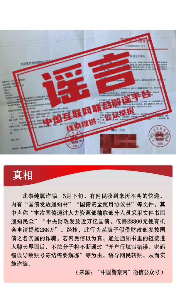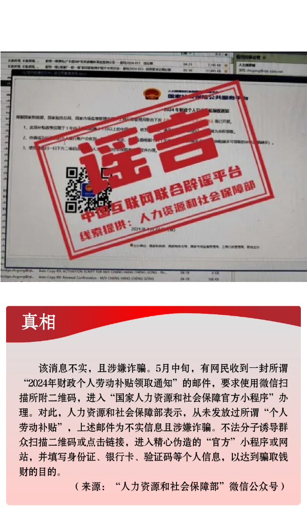 假冒官方行骗敛财。5月以来,一些不法分子通过伪造“红头文件”、虚构官方项目等方式,打着“领取补贴”“投资项目”“发放国债”等旗号,设置骗局,实施诈骗。如冒充国家部委发布“扫码可领‘2024年个人劳动补贴’”邮件,伪造“官方”小程序或网站,骗取钱财;打着国家工程或项目的幌子谎称“‘藏水入疆’工程将于9月正式开工”“新疆5G机站管网线路预埋项目施工”,发布所谓投资项目帖文,诱骗投资;假借财政部发行国债之名,伪造“红头文件”,声称“收到‘国债发放通知书’便有机会申请提款288万”,诱导转账。此外,还有人造谣称“文旅部门帮某农家乐推荐引流”,实则是为博取眼球、吸引游客故意编造的不实言论。