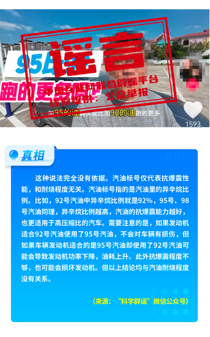 伪科普误导公众认知。部分网民利用专业领域信息差,曲解科学概念或传播错误知识。谣言“95号汽油更耐烧”利用车主对油耗的关注,混淆汽油标号(异辛烷比例)与燃烧效率的概念,传播错误认知。谣言“暴雨时躲在车内更安全”违背防汛自救原则,可能导致公众在极端情况下做出错误选择,危害生命。值得关注的是,近期网上还出现“米汤可代替母乳和奶粉喂养孩子”“植物奶可以替代配方奶粉”“纯素食可以满足孕期全部营养需求”等系列谣言,打着“中医”“科普”旗号,宣扬错误喂养知识,严重误导母婴群体,宣扬该观点的博主已因发布谣言被平台禁言。
