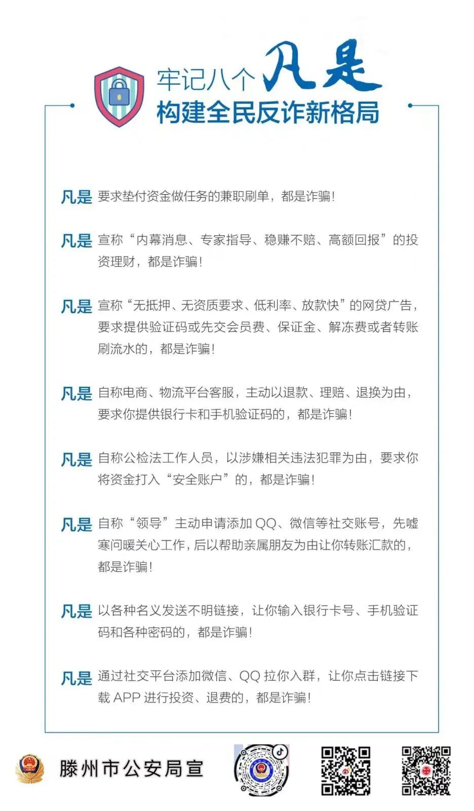 4、◆划重点:凡是自称公检法要求汇款的、凡是叫你汇款到“安全账户”的、凡是通知中奖、领取补贴要你先交钱的、凡是通知“家属”出事要汇款的、凡是在电话中索要银行信息及短信验证码的、凡是让你开通网银接受检查的、凡是自称领导要求打款的、凡是陌生网站要登记银行卡的,请大家谨慎核实,不要轻易相信。