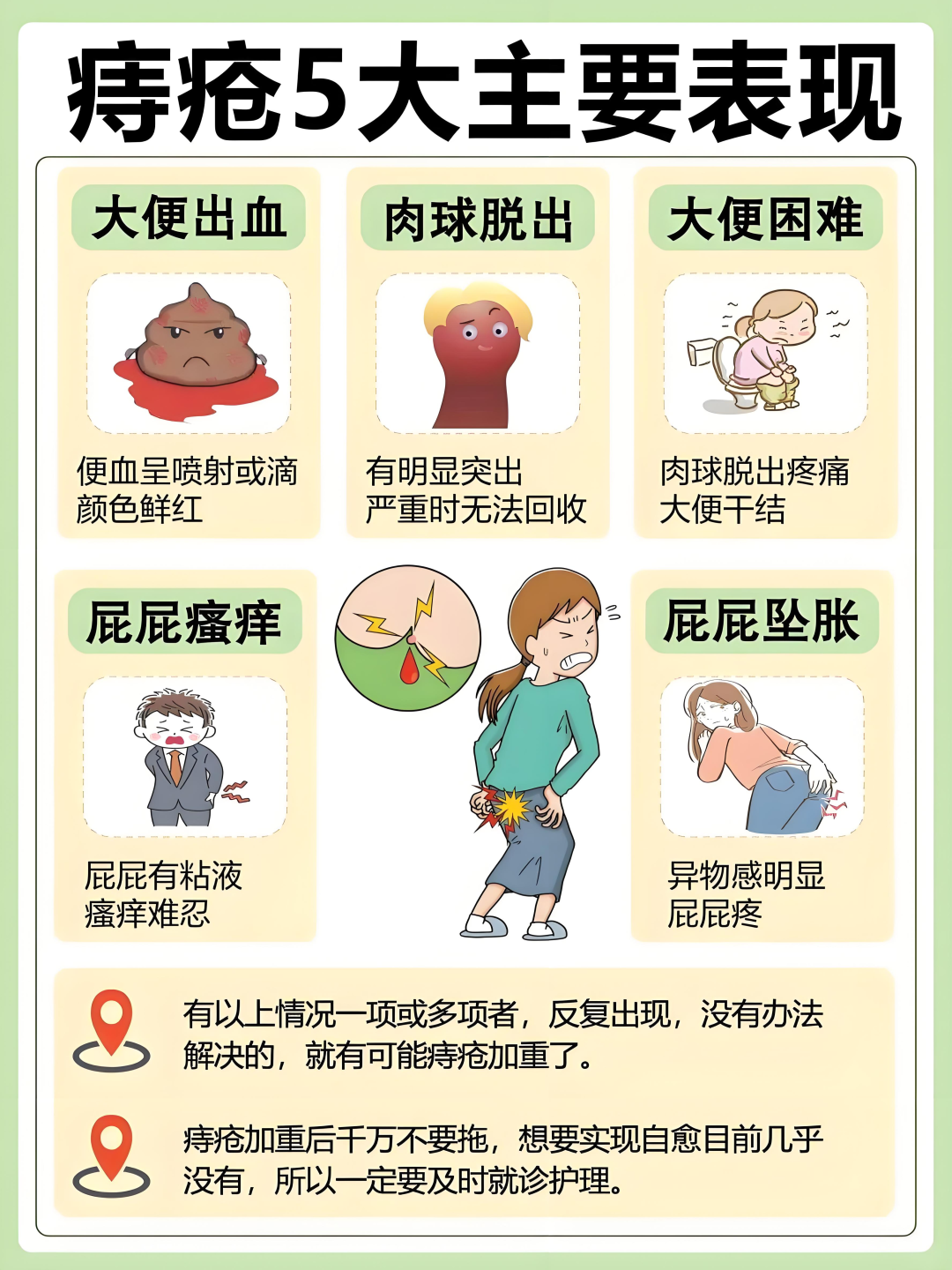 1.便血:肛肠疾病的主要症状有大便出血、肿物脱出、疼痛、流脓、瘙痒、便秘等,其中以大便出血为常见症状,一般颜色鲜红、出血量可多可少,如长时间反复出血,应尽早就医检查,以排除肠道肿瘤等疾病。2.肛周疼痛:肛周疼痛的原因有很多,如:炎性外痔、血栓外痔、肛裂、内痔脱出嵌顿、肛周脓肿等。通常非常痛苦,需要及时治疗以减轻疼痛和防止感染。3.肛门坠胀:肛门坠胀感可能是肛门周围炎症、痔疮、肛窦炎等疾病引起的。会影响我们的生活和工作,需要及时就医检查以确定病因并及时治疗。4.肛门瘙痒:多数肛肠疾病患者会出现肛门有瘙痒感和肛门潮湿。5.排便习惯改变:排便习惯改变可能是结直肠癌、肠息肉等疾病的早期信号。如排便习惯出现明显变化如次数增多,大便性状改变,应该尽早就医检查,以排除潜在的疾病。6.便秘:长期便秘可能导致肠道疾病和其他健康问题,应尽早就医检查并采取适当的治疗措施。