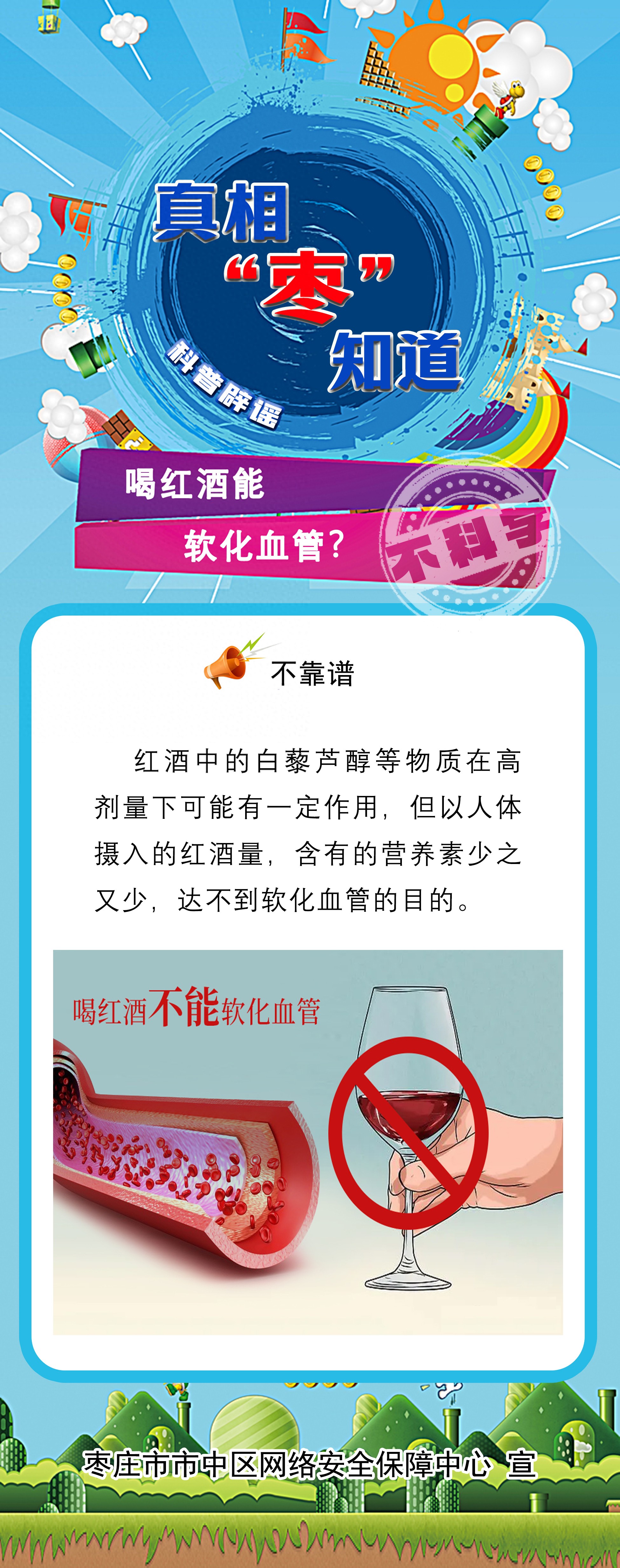 红酒中的白藜芦醇等物质在高剂量下可能有一定作用,但以人体摄入的红酒量,含有的营养素少之又少,达不到软化血管的目的。