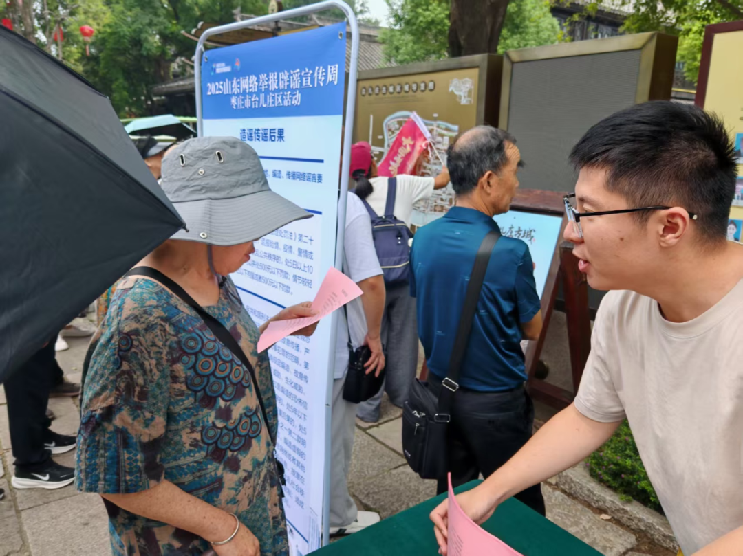 为深入推进网络生态治理,不断提升广大市民和游客对网络谣言辨识力和举报意识。9月15日,台儿庄区委网信办以“网络举报e齐行·共筑清朗好空间”为主题,在台儿庄古城景区开展网络举报辟谣宣传活动。