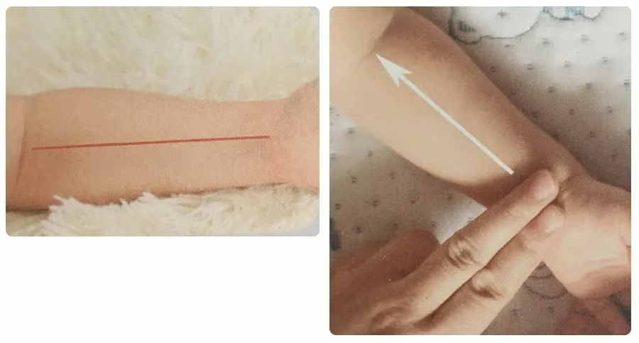 1、推法:家长一手持小儿手部,另一手用食、中二指指腹蘸温水,沿孩子前臂正中线从腕横纹起推至肘横纹。